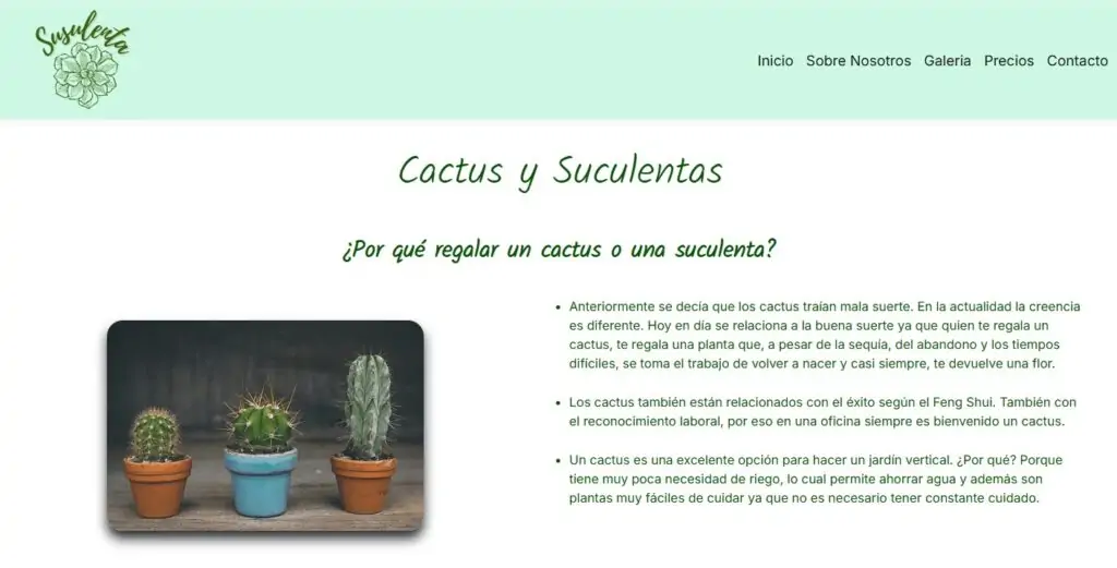 Primer proyecto web desarrollado con HTML, CSS y Bootstrap. Una página informativa sobre suculentas, optimizada para ser responsive y con un diseño limpio, ideal para mi inicio en el diseño web. Realizada como proyecto final del curso.